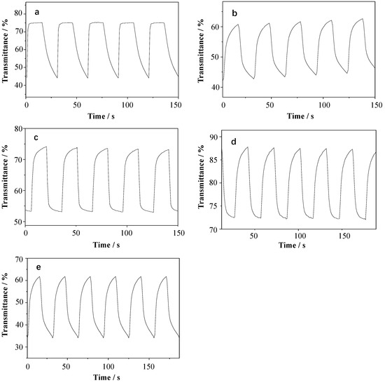 Figure 4 and Table 3 display the graphs and data sheets of the transmittance for the alkyl viologen films at 558 nm a test interval time of 15 s. Figure 4a describes the optical transmittance of the OV film. The coloring response time (RTc) and bleaching response time (RTb) were defined as the time required to reach 90% of the total change in transmittance after switching the potential. The OV film bleached and colored when the voltage changed from 0 V to −0.7 V, obtaining a maximum contrast (ΔTmax) of 33%. The RTb and RTc of the OV film were 0.95 s and 8.16 s (Table 3), respectively.