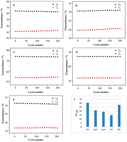 The transmittance (a–e) and ΔT200 (f) of OV, DeV, DoV, HV, and BV films under continuous cycling between colored and bleached states.