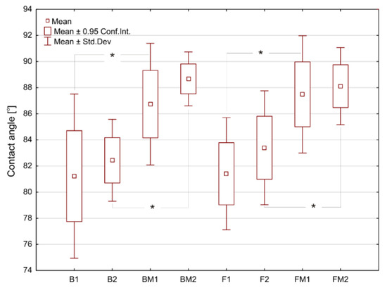 The surface water contact angles determined for tested materials. Asterisks (*) point at statistically significant differences (p < 0.05) according to the unpaired t test.