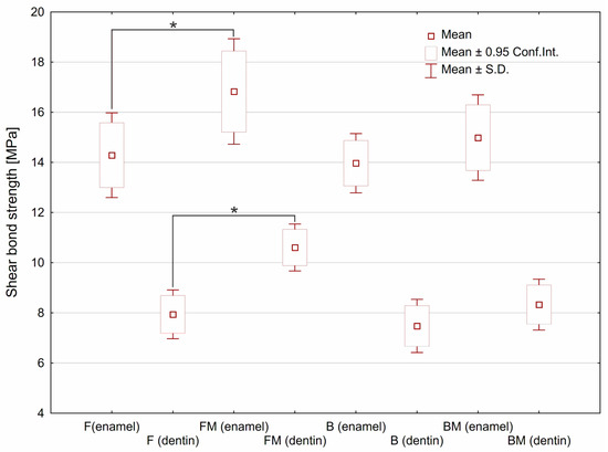 The shear bond strength estimated for tested materials depending on type of the tooth tissue. Asterisks (*) point at statistically significant differences (p < 0.05) according to the unpaired t test.