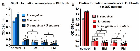 Quantification of the adhered bacteria to the B, BM, F, and FM materials compared to the control surface (polystyrene): (a) biofilm formation on materials in BHI broth; (b) biofilm formation on materials in BHI broth with 0.25% sucrose; results are shown as mean values ± SD from triplicate experiments; * indicates statistically significant results (p < 0.05) compared to the control, # indicates statistically significant results (p < 0.05) between unmodified and corresponding modified composite (the unpaired t test).
