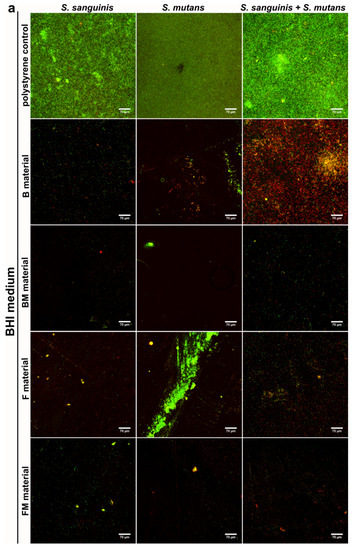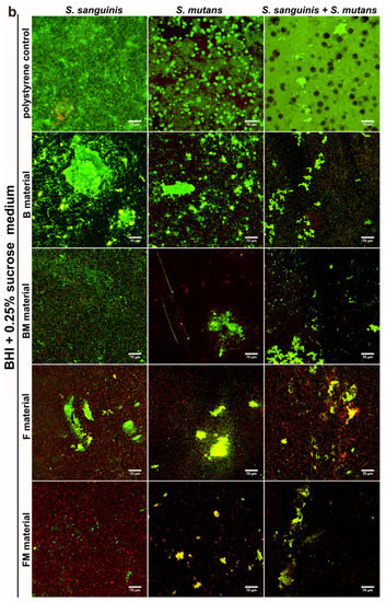 Results obtained with the quantitative assay were next confirmed by biofilm determination with the use of CLSM. The CLSM images presented in Figure 4a,b show S. mutans and S. sanguinis mono- and mixed-species biofilm on the materials surface with viable (stained green) and dead colonies (stained yellow-red). Surface of the disc without biofilm is visible as a non-stained area (no fluorescent signal—black color).