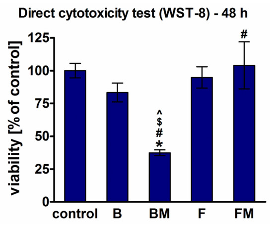 Cytotoxicity of the materials assessed by WST-8 test after direct 48 h contact of BJ fibroblasts with the materials (*significantly different results compared to the negative control of cytotoxicity, #significantly different results compared to the B material, $significantly different results compared to the FM material, ^significantly different results compared to the F material, according to one-way ANOVA test followed by Tukey’s multiple comparison test, p < 0.05).