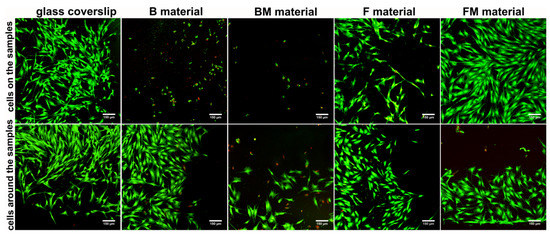 Qualitative evaluation of materials’ cytotoxicity by live/dead double staining of BJ fibroblasts cultured for 48 h on the materials’ surfaces, and grown around the samples (viable cells—green fluorescence, nuclei of dead cells—red fluorescence, apoptotic cells—green and red florescence); magn. 100×, scale bar = 150 µm.