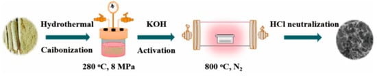 It is worth noting that porous activated carbon is an ideal electrode material for supercapacitors. Biomass-derived porous carbon can inherit special microstructures from precursors, which provide active sites for many ions transport channels and energy storage. High specific surface area and hierarchical porous structure are the most important two main factors, which would affect the electrochemical properties of carbon materials [11]. A high specific surface area could provide sufficient active positions for charge storage. The appropriate pore structure can improve capacitance by increasing the electrode–electrolyte interface area and providing a suitable channel for electrolyte ions’ entry [12]. In previous studies, most of the porous carbons were synthesized by a two-step method [13,14,15,16]. The first step was pre-carbonization, and the second step was pyrolysis or activation. There have been many previous studies that preferred low-temperature pyrolysis pre-carbonization. Hydrothermal carbonization (HTC) greatly impacts the synthesis of hydrocarbon, and hydrothermal carbonization can transfer oxygen-rich substituents to carbon materials [17]. HTC technology is also a simple, economical, and efficient method [18]. It is one of the most popular thermochemical conversion techniques for biomass carbon-based materials in terms of preparation strategy, with two advantages. First, because of hydrothermal carbonization and chemical activation, the subsequent activation process’s efficiency is improved, reducing the total cost of production. Second, the two-step process improves the microstructural characteristics of the final material [19].