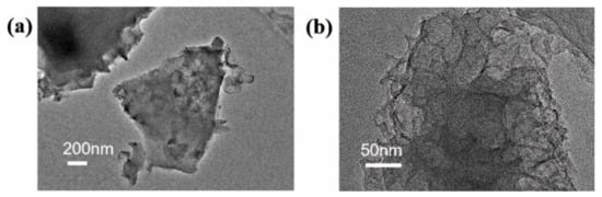 The pore structure of TC-1 was further observed by TEM (Figure 3). TC-1 exhibited an interconnected porous structure. Abundant micropores and mesopores of the carbon skeleton were observed from high-resolution TEM images. The interconnected porous structure act as electrolyte reservoirs to ensure a rapid entry of ions into the porous carbon wall, facilitating rapid electron transport and charge storage. These advantages result in a structure with electrochemical properties.