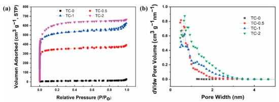 The Raman spectra of TC-0, TC-0.5, TC-1, TC-2 are illustrated in Figure 5a. The peak at ~1334 cm−1 corresponds to the D band represents the structural defect and disorder. The peak at ~1600 cm−1 belongs to the G band, indicating the E2g phonon of sp2 carbons [33]. The intensity ratio (ID/IG) between the D band and the G band indicates the degree of graphitization. The ID/IG of TC-0, TC-0.5, TC-1, TC-2 are 1.26, 1.19, 1.10, 1.03, respectively. It shows an enhancement in graphitization of samples after KOH activation, thereby improving the conductivity of activated carbon.