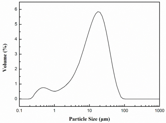 Microcrystalline wax (melting point: 87–92 °C) was obtained from Ningbo Yanyu Biotechnology Co., Ltd., Ningbo, China). E-51 epoxy resin and N, N-dimethylformamide were purchased from Ningbo Yongchuan Biotechnology Co., Ltd., Ningbo, China). 2-ethyl-4-methylimidazole, perfluorotributylamine, and acetone were supplied by Shanghai Molbase Biotechnology Co., Ltd., Shanghai, China). Portland cement (P.O 42.5) was bought from Anhui Conch Cement Co., Ltd., Wuhu, China. The chemical composition of cement is shown in Table 1, and the particle size distribution of cement is described in Figure 1. River sand (modulus: 2.35) was applied by Ningbo Pulunxiang building materials Co., Ltd., Ningbo, China).