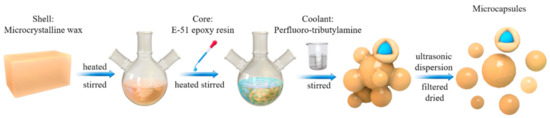 Microcapsules were prepared by the melt–dispersion–condensation method. The melt–dispersion–condensation method is a physical preparation method, and no chemical reaction occurs during the preparation of microcapsules, avoiding possible chemical contamination from the source. It is a green preparation method that conforms to the concept of sustainable development. Firstly, the microcrystalline wax was melted and dissolved in a three-necked round-bottom flask to prepare microcapsules at 95, 105, and 115 °C, respectively. Then, E-51 epoxy resin diluted with N, N-dimethylformamide (DMF) was added dropwise to the liquid microcrystalline wax for more than 30 s. The amount of DMF was 15% of the weight of E-51 epoxy resin, and the shell/core weight ratios were 1.2:1, 1:1, 1:1.2, and 1:1.4, respectively. The shell/core mixture were stirred for 4 h at a certain stirring speed (300, 600, 900, and 1200 rpm). Then, perfluorotributylamine was added to the mixture, and the temperature was rapidly reduced to below the melting point of microcrystalline wax to obtain the microcapsule suspension. After that, the suspension was oscillated for 15 min by ultrasonic wave. Finally, the microcapsules were filtered out from the mixture and dried for 24 h at 75 °C. Figure 2 depicts a schematic diagram of the preparation process.