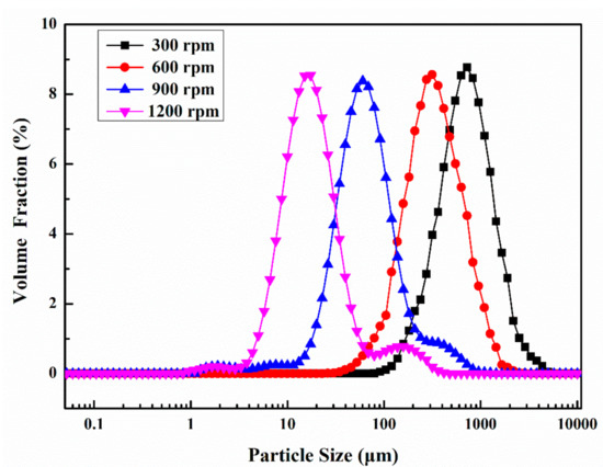 Figure 5 demonstrates the particle size distribution of microcapsules prepared at 105 °C with a shell/core weight ratio of 1:1.2 and at different stirring speeds. The D10, D50, and D90 values of the microcapsules are shown in Table 3. In Figure 5, the particle size distribution of microcapsules indicated a decreasing trend with increasing stirring speed. As shown in Table 3, when the stirring speed was 300 rpm, the particle size distribution of microcapsules was 316–1200 μm. After the stirring speed reached 600 rpm, the particle size distribution of microcapsules was 104–831 μm. For the microcapsules with stirring speed of 900 rpm during the preparation process, the particle size distribution declined significantly to only 23–182 μm. The particle size distribution of microcapsules varied from 7 to 52 μm when the stirring speed went up to 1200 rpm. According to Table 3, the average particle sizes of microcapsules prepared at 300, 600, 900, and 1200 rpm were 630, 275, 60, and 17 μm, respectively. This is because during the preparation of microcapsules, with the increase of stirring speed, the magnetic stirring bar provided higher shear force to the microcrystalline wax/E-51 epoxy resin mixture. When the stirring speed is higher, the liquid microcrystalline wax is dispersed more uniformly under the high shear force, and the E-51 epoxy resin will be dispersed in microcrystalline wax in the form of smaller droplets. Therefore, when perfluorotributylamine is added, microcapsules with smaller particle size are likely to be generated during the solidification process.