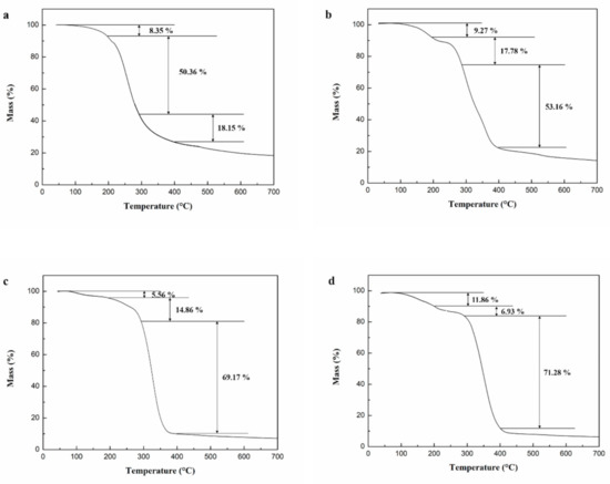 As shown in Figure 6a, when the shell/core weight ratio of microcapsules was 1.2:1, the mass of microcapsules decreased by 8.35%, 50.36%, and 18.15% in the range of 100–198, 198–280, and 280–396 °C, respectively. However, the mass of microcapsules decreased by 9.27%, 17.78%, and 53.16% in the ranges of 100–198, 198–280, and 280–396 °C, respectively, while the shell/core weight ratio of microcapsules declined to 1:1 (Figure 6b). In Figure 6c,d, the mass loss of microcapsules increased to 69.17% and 71.28% in the range of 280–396 °C as the shell/core weight ratio continued to drop to 1:1.2 and 1:1.4. The results indicated that the mass loss of microcapsules increased significantly with the decrease of shell/core weight ratio at temperatures from 280–396 °C, indicating that more E-51 epoxy resin was encapsulated into the microcrystalline wax. This is consistent with the results in Section 3.1.