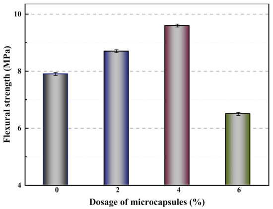 Figure 9 shows the flexural strength of mortars containing different contents of microcapsules after 28 days of standard curing. From Figure 9, the flexural strengths of M-0 (control mortar), M-1 (mortar with 2% cement weight microcapsules), M-2 (mortar with 4% cement weight microcapsules), and M-3 (mortar with 6% cement weight microcapsules) are 7.9, 8.7, 9.6, and 6.5 MPa, respectively. Compared with M-0, the flexural strength of M-1 and M-2 increased by 10.1% and 21.5%, respectively. When the microcapsule content increases to 6% (M-3), the flexural strength of mortar is reduced by 17.7% compared with M-0. The results showed that the mechanical properties of the mortar were enhanced and then decreased with the increase of microcapsule content. This is due to the large difference in Young’s modulus between the microcapsules and the cement matrix, and the addition of microcapsules causes gaps in the bonding surface of the microcapsules and the matrix material. The more microcapsules content, the more pores in the matrix material, and consequently, the stiffness is reduced and the flexural strength also declined. However, the addition of a small dosage of microcapsules is conducive to improving the fluidity and compactness of the mortar, making the structure of the mortar compact and improving the flexural strength [34].