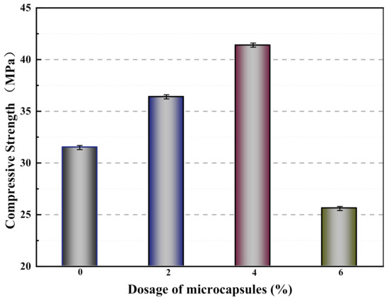 The compressive strengths of mortars containing different microcapsule contents after 28 days of standard curing are indicated in Figure 10. The compressive strengths of M-0, M-1, M-2, and M-3 were 31.5, 36.4, 41.4, and 25.6 MPa, respectively. Compared with M-0, the compressive strengths of M-1 and M-2 increased by 15.6% and 31.4%, respectively. The reason for this is that mortar is a mixture of materials with different particle sizes, and there is a certain dosage of voids in the mortar. A suitable dosage of the microcapsules can fill the internal voids of the mortar and improve its compressive strength [27]. In contrast, the compressive strength of M-3 decreased by 5.7% compared with that of M-0. This may be due to the large difference in modulus between the microcapsules and the cement matrix, and when excessive many microcapsules are mixed into the mortar, the bonding surface of the microcapsules and the matrix material is prone to gaps. The increase of these gaps both reduces the compactness of the mortar in the molding process and affects the particle gradation of the cementitious material, which eventually leads to the decrease of the compressive strength of the mortar.