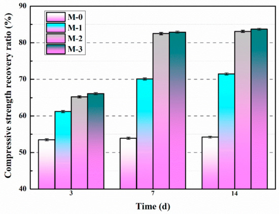 Figure 11 describes the compressive strength recovery ratios of mortars containing different contents of microcapsules with variable self-healing time. According to Figure 11, the compressive strength recovery ratio of M-0 does not change with increasing self-healing time, indicating that the intrinsic self-healing ability of cementitious materials cannot effectively self-heal the pre-damaged M-0 within 14 days.