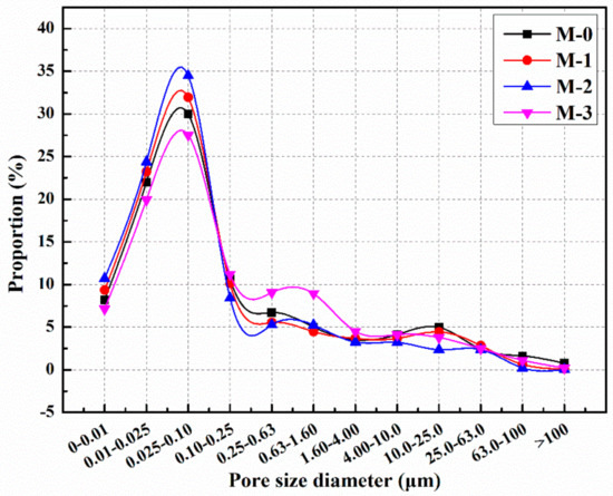 For cementitious materials, it is generally considered that pores with a diameter of less than 0.1 μm are harmless or, at least, less harmful, and pores with a diameter of more than 0.1 μm are harmful and have a strong influence on the mechanical properties and impermeability of cementitious materials [28]. In this section, the pores with a particle size greater than 0.1 μm are referred to as harmful pores.