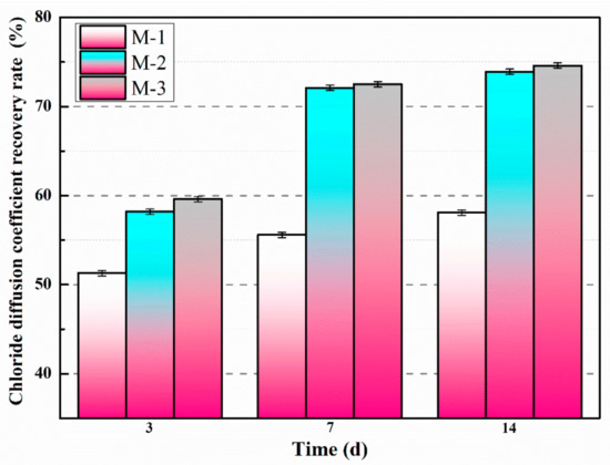 The chloride diffusion coefficient recovery rates of the mortars with microcapsules at different self-healing time are described in Figure 16. The chloride diffusion coefficient recovery rates of M-1, M-2, and M-3 after self-healing were significantly improved from Figure 16. The chloride diffusion coefficient recovery rates of M-1, M-2, and M-3 increased rapidly from day 3 to day 7, and remained essentially constant from day 7 to day 14. After 14 days of self-healing, the chloride diffusion coefficient recovery rates for M-1, M-2, and M-3 were 58.1%, 73.9%, and 74.6%, respectively. This is mainly due to the presence of microcracks in the mortar after preloading, and the stress at the tips of the microcracks can rupture the microcapsule. The released E-51 epoxy resin cured in contact with 2-ethyl-4-methylimidazole and self-healed the microcracks. As the dosage of microcapsules in the mortar rises, the content of E-51 epoxy resin available for self-healing also increases, thereby improving the self-healing ability of the mortar containing microcapsules.