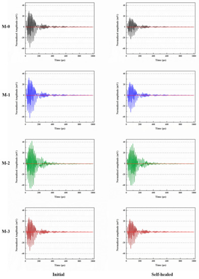 Figure 17 shows the ultrasonic waveforms before and after self-healing of mortars with different contents of microcapsules. It can be observed from Figure 17 that the maximum amplitudes of M-0, M-1, M-2, and M-3 were 29.63, 32.59, 42.15, and 26.93 mV, respectively, after 28 days of standard curing. Compared with M-0, the maximum amplitudes of M-1 and M-2 increased to a certain extent, while the maximum amplitude of M-3 declined. This is because when the ultrasonic waves propagate in mortar, the acoustic impedance of mortar is much larger than that of air, so when pores are encountered, the ultrasonic signal attenuates, resulting in a decrease in the amplitude of the received signal [39]. When the compactness of the mortar is higher, the ultrasonic signal encounters fewer internal defects such as pores, the signal attenuation amplitude is smaller, and the wave amplitude is relatively larger. According to Section 3.8, M-2 has a lower harmful pores proportion, so its amplitude is higher.