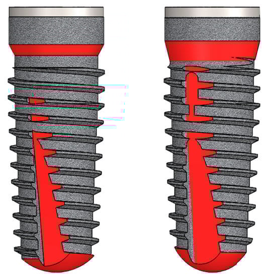 - Ma, P.; Xiong, W.; Tan, B.; Geng, W.; Liu, J.; Li, W.; Li, D. Influence of thread pitch, helix angle, and compactness on micromotion of immediately loaded implants in three types of bone quality: A three-dimensional finite element analysis. Biomed. Res. Int. 2014, 2014, 983103. [Google Scholar] [CrossRef]