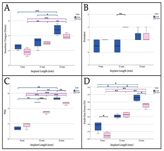 Boxplots illustrating (A) insertion torque, (B) Periotest® measurement, (C) resonance frequency analysis and (D) push-out forces of the J- and K-lines at different implant lengths in “hard” bone. Within-group significance in assigned colors (J-line blue, K-line pink) and between-group significance is assigned in black. Shown are means ± SD, * p < 0.05, ** p > 0.01, *** p < 0.001.