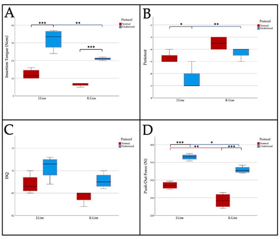Boxplots illustrating (A) insertion torque, (B) Periotest® measurement, (C) resonance frequency analysis and (D) the push-out forces of the J- and K-line for different drilling protocols in “soft” bone. Within-group significance in assigned colors (J-line blue, K-line pink) and between-group significance is assigned in black. Shown are means ± SD, * p < 0.05, ** p > 0.01, *** p < 0.001.