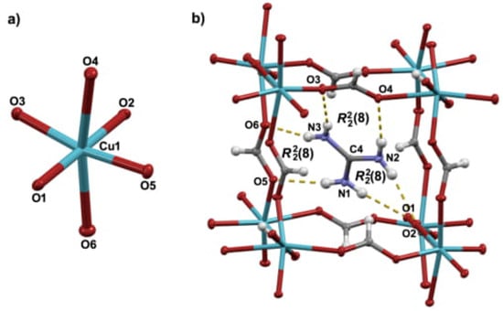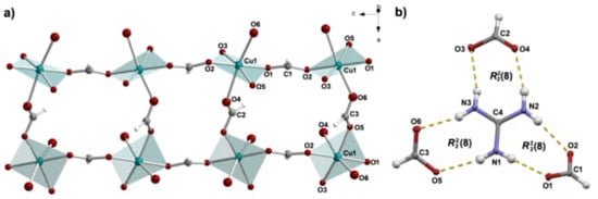 (a) The chains of CuO4 units (defined by two short and two medium Cu–O bond lengths). The chains, which run along the crystallographic c-axis are formed via two medium Cu–O bonds of the formate anions. The chains further associate through long and short Cu–O distances, which involve formate anions. Guanidinium cations are not shown for clarity reasons. (b) Hydrogen bonds and the related graph-set notations formed by guanidinium cation. Hydrogen bonds are presented by yellow dashed lines.