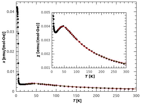 Susceptibility obtained from the temperature dependence of magnetization in 1000 Oe is shown in Figure 3. The broad peak, with the maximum at 45 K, points to the existence of antiferromagnetic (AFM) chains with relatively strong intra-chain coupling. The strength of the AFM interaction was obtained by fitting the data with the Bonner-Fisher formula for antiferromagnetic (AFM) spin 1/2 chains []: