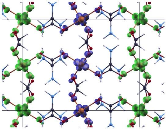 Spin polarization density (difference of electronic density of spin up and spin down) of ground state. Spin up polarization is shown with blue isosurfaces and spin down polarization is shown with green isosurfaces. Horizontal is crystallographic c direction and vertical is crystallographic a+b direction.