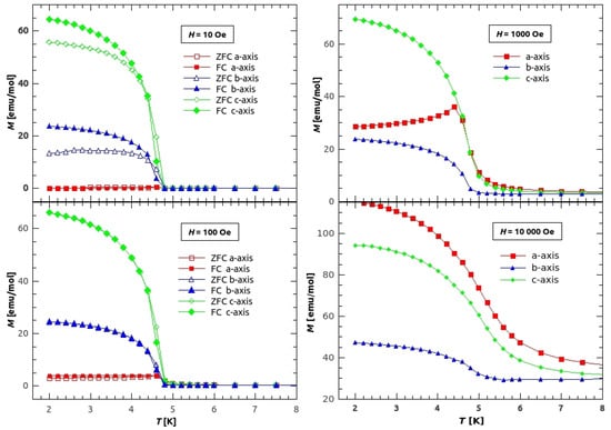 If we look at the magnetization of the single crystals (Figure 5 and Figure 6), we can see a large difference in magnetization, both in and in , along different crystallographic axes, which indicates a large magnetic anisotropy of the compound.