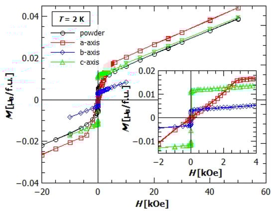 The field dependence of magnetization of single crystals at 2 K, (Figure 6) clearly shows the anisotropic behaviour discussed above. At the lowest fields, till around 20 Oe, the magnetization in b and c direction increases rapidly and achieves the values μ and μ per Cu2+ ion. After this initial rapid increase, they continue with slow linear increase with the same slope. The magnetization in a direction starts to increase with the field with much smaller rate, achieving only μ (one formula unit—f.u. contains one Cu2+ ion) at 20 Oe. After 20 Oe it continues with the same slope, and at the field of 800 Oe attains larger value of magnetization than in b direction, while at fields larger than 2300 Oe it becomes larger than . After 3000 Oe, it becomes harder to increase the magnetization further, the change of the magnetization stays linear, and the rate at which it changes with field becomes equal to the slopes of and .