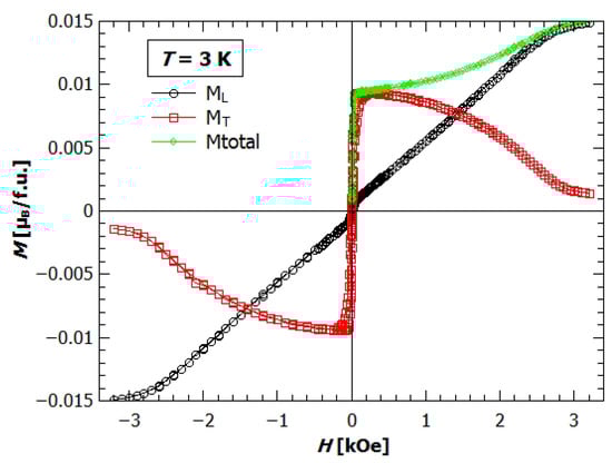 Figure 7 shows the field dependence of magnetization at 3K, measured simultaneously along the field applied in a direction (longitudinal magnetization, ) and perpendicular to the field (transverse magnetization, ). With horizontal rotator the crystal is firstly rotated in such a direction, so that the detector coil measures in the direction of maximum value of magnetization in the plane perpendicular to the applied field (here that is along c-axis, as it is the easy axis). It can be seen that even though the field is applied in a direction, the magnetization in the plane is larger than in a direction. Only the fields higher than 3 kOe manage to overcome the anisotropy of the crystal and magnetize the sample in the direction of vertically applied field, that is, the longitudinal direction. If we look at the total magnetization as a vector, we can calculate its value and angle of direction and observe how do they change with the applied field. The value of total magnetization is shown on the Figure 7 with the green diamonds. For the small fields the vector of total magnetization lies in c direction and is almost equal to the . Increasing the field the direction changes almost linearly towards the a direction till around 2.5 kOe, where it is almost parallel to the a axis.