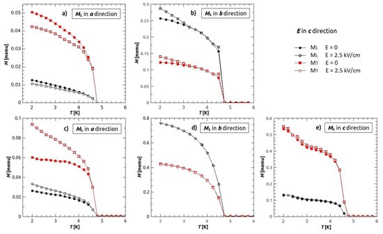 The influence of the electric field E on magnetization was observed as a change in the value of magnetization M at the temperatures below . On Figure 9, measurements of magnetization with (empty symbols) and without (filled symbols) the electric field applied in c direction is shown. Five figures represent five different measurement setups where the magnetization was measured along a (Figure 9a,c), b (Figure 9b,d) and c crystal axis (Figure 9e). Measurements were done in different remanent fields and different attempts of orienting the crystal. The measurements on Figure 9a,b were done when the superconducting magnet was first time cooled, before turning on the magnet so that there was no remanent magnetic field present, while Figure 9c–e measurements were done after the magnet was used, thereby having some remanent field which was not possible to quantify or remove completely. For each setup, the transverse component of magnetization (the maximum value of magnetization in the plane perpendicular to the magnetic field direction) was measured at the same time as the longitudinal component. Black circles represent longitudinal, while red rectangles transverse component of magnetization. Obviously, the vector of magnetization is changed solely by electric field, since we did not apply any magnetic field. For measurements on Figure 9a,b the magnetometer’s superconducting magnet in a fresh state is used having no remanent magnetic field and the crystal was magnetized only by the Earths magnetic field, while for measurements on Figure 9c–e there is some unknown remanent field. This still makes complications in interpretation since crystal is oriented differently with respect to the Earths magnetic field and remanent field, making it hard to compare the measurements and deduce precise conclusions about the exact change of the vector of magnetization. In that sense our experiment is complementary to the findings in [] where they have applied relatively large magnetic field (1 kOe) during magnetoelectric measurement and obtained relative change of magnetization of 7%. Our experiment is different and has different results, since we changed the almost spontaneous magnetic state using the electric field alone.