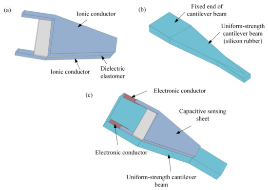 We developed a soft tactile force/displacement sensor, constituting a uniform- strength cantilever beam and capacitive sensing sheet. The capacitive sensing sheet is designed such that the dielectric layer (Eco-Flex 00-50) is sandwiched between two ionic conductors, as shown in Figure 1a. Figure 1b shows the structure of the soft uniform-strength cantilever beam (silicon rubber). The capacitive sensing sheet is attached to the soft cantilever beam with the viscidity of ionic conductors (hydrogels), and a thin line of each ionic conductor is connected to a metallic electrode (electronic conductor) fastened onto the fixed end of the cantilever beam, which creates a sensing system (see Figure 1c).