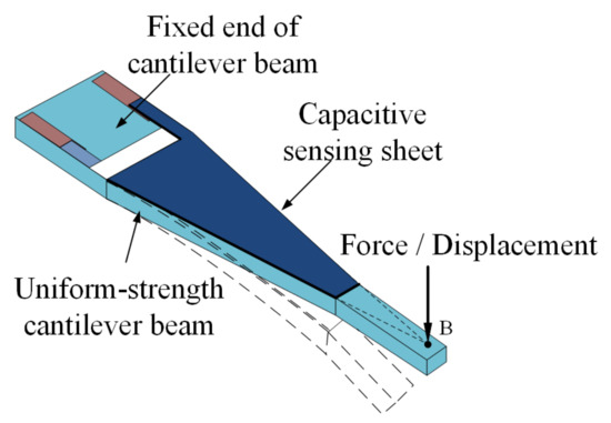 As seen from the Equations (11) and (12), the merit of the uniform-strength beam configuration is that the strain of the capacitive sensing sheet along the x-direction is uniform, and does not change with the coordinate points in the x direction. According to Equations (13) and (31), the capacitance change is linear to the force/deflection at the free end of the beam. Theoretically, the proposed sensor can be used to measure force and displacement.