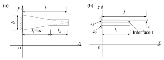 When normal force/displacement is applied at the free end of the cantilever sensor (see Figure 3), the correlation between the capacitance change and normal force/displacement is derived. The geometry of the sensor is shown in Figure 4. The sensor includes two segments (l1 and l2) in the x-direction. Different segments comprise a different number (k) of layers. For the segment 1, k = 4, in which one is beam and three are the capacitance-sensing sheet. For the segment 2, k = 1, that is the beam itself. For deriving a reasonably simplified model, some basic assumptions should be set as—(1) the sensor is in a static equilibrium and small deformation state; (2) the Euler–Bernoulli model is employed here, because the uniform-strength cantilever beam is relatively long; and (3) adjacent layers are all compatible, adjacent segments of the beam are continuous.