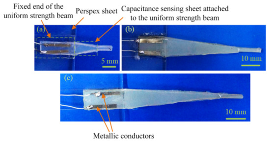 The extremity of the uniform strength beam was pasted on a perspex sheet by employing a double-sided tape (VHB4910, 3M, Paul, MN, USA) and cyanoacrylate adhesive (502, Deli, Ningbo, China). Two metallic conductors (nickel plates) were fixed at the extremity for connecting ionic conductors and wires. Figure 5 illustrates the prepared sensors based on the uniform-strength cantilever beam. The capacitance-sensing sheets are almost transparent because the ionic conductors and dielectrics have excellent transparency.