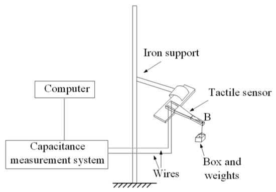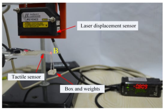 For the force sensing analysis, the perspex sheet (the extremity of the tactile sensor) was clamped to an iron support, as shown in Figure 6. To concentrate the load, a self-made paper box (10 mgf) and weights (F1, Penglai Shui Ling weight factory, Penglai, Shandong, China) were applied to the free end (point B) of the uniform-strength cantilever beam. We applied the concentrated force from 0 to 1.47 mN (150 mgf) by employing a constant load of 0.098 mN (10 mgf) for each step.