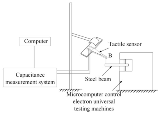 For the displacement-sensing analysis, the extremity of the tactile sensor also was clamped to an iron support (see Figure 7). To apply the displacement load, the free end (point B) is connected through an inextensible nylon wire to a steel beam fixed to microcomputer control electron universal testing machines (WDW-100C, Shanghai hualong test instrument co., Ltd., Shanghai, China). The displacement was achieved by applying vertical down tension to the nylon wire with a velocity and data acquisition frequency of 6 mm/min and of 20 Hz, respectively.