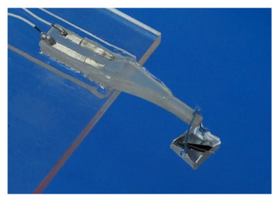 The uniform-strength cantilever beam is comprised of silicone rubber. Two types of silicone rubbers were used for the beams of the three sensors. One of the beams was fabricated using the silicon rubber (Eco-flex 0050), which was obtained by curing a mixed and degassed two-part Eco-Flex prepolymer in a 1:1 weight ratio for 3 h at room temperature. The Eco-flex used for the beam was curded into a silicon rubber sheet in the self-made glass mould. The elasticity modulus of Eco-flex 0050 is 83 kPa [34]. The other two beams were manufactured using the silicon rubber sheet (gjb001, DaoGuan, Shanghai, China). The elasticity modulus of the silicon rubber (gjb001) is 2.654 MPa (see Figure S2 of Supplementary Information).