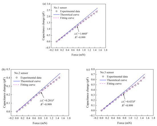 The No.1 sensor shows the highest sensitivity among the three sensors. Moreover, the No.1 sensor has an excellent linearity (R2 = 0.999), compared with the flexible pressure sensor with high linearity (R2 = 0.995) in the literature [21] and soft cantilever sensors in the literature [28,29,30].