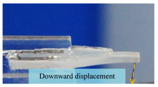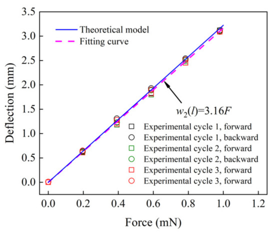 Hence, the results showed that the tactile sensor is extremely soft, and can be used to accurately measure the force of soft objects 20 μN–1 mN, which corresponds to the displacement of 70 μm–3 mm. It should be noted that the relationship between the force and displacement at the free end of the beam is based on as illustrated in Figure 16.