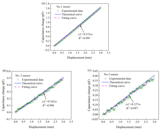 Capacitance change with the displacement applied to (a) No.1, (b) No.2, and (c) No.3 sensor.