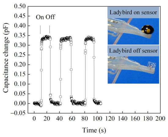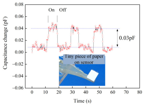 First, several tests were conducted for analyzing the low detection limit of the tactile sensor (No.1 sensor). The sensor was reliably used to detect the ultra-small weights, such as a dried ladybird (weight—21 mgf) and a tiny piece of paper (weight—2 mgf). They were placed and removed on a small PET plate (3 mm2 × 3 mm2) fixed to the free end of the beam, as shown in Figure 12 and Figure 13. The ultra-small weights (21 and 2 mgf) caused obvious capacitance changes, which corresponded to the average values of 0.34 and 0.03 pF. The sensor can be used to measure force as low as 19.6 μN (2 mgf), which is a tenth of the lowest touch of female fingertip [35].