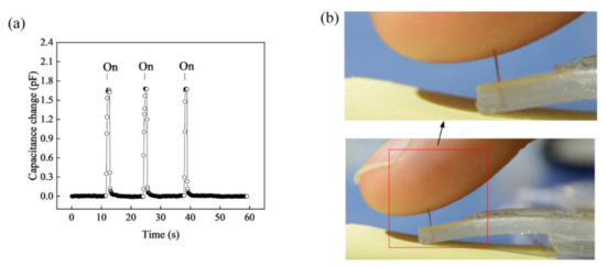 (a) Capacitance change with time for (b) fingertip pressing on and off the free end of the tactile sensor.