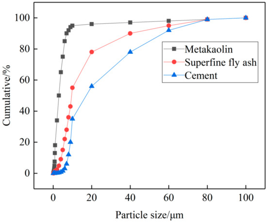 Metakaolin is made by mineral kaolin after being roasted at 500~900 °C. MK used in this study is made by Shanghai Lingdong Co., Ltd. (Shanghai, China), particle size: 1.8 μm. The particle size distribution is shown in Figure 1. As shown in Figure 2a and Figure 3a, it is white powder with irregular shape.