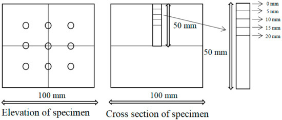 According to GB/T 176—2008 [41], the optimized barium sulfate precipitation method (titration) is used to check the content of sulfate ions in the concrete powder. An impact drill is used to drill and get core powder of concrete blocks at different stages of erosion. Nine holes were drilled symmetrically in each block and mixed the powder drilled from depth of 0, 5, 10, 15, 20 mm together, which should be ground by mortar and tested later. The sampling process is shown in Figure 4.