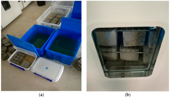 The dry state and wet state are as shown in Figure 5a,b. The dry-wet cycle process is briefly described as follows: immersing for 15 h → drying in room temperature 1 h → drying in oven at 60 °C 7 h → cooling in room temperature for 1 h. Based on the GB/T 50082-2009 [42], we also referred to the research of Wang [38] and Zhao [43], and the chemical composition of ions in the soil and groundwater in Western China. A 10% solution of Na2SO4 and a 10% solution of MgSO4 are used as the erosion medium. The experiment includes four periods, i.e., the dry-wet alternation for 20, 40, 80, and 120 cycles respectively. During the test, the PH value of the immersing solution was checked once every seven days, and the PH value was kept at 7.00 ± 0.50 with pure concentrated sulfuric acid. The solution was changed every 20 days.