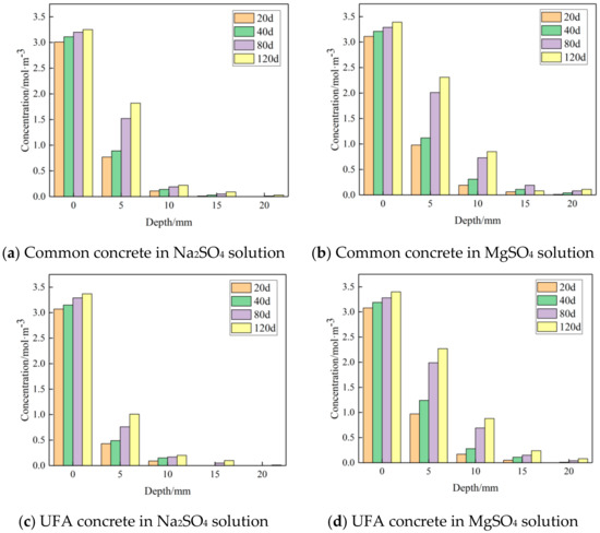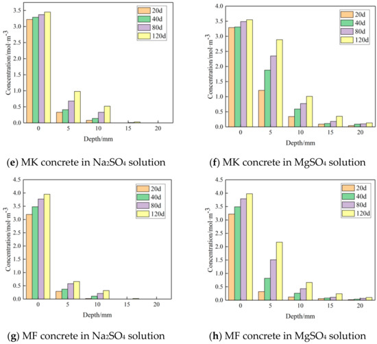 Although the erosion solutions in this study were all 10% sulfate solutions, they varied in molar concentration of sulfate ions. In order to determine the sulfate iron concentrations in different circulation periods from the surface to the internal part of all groups of concretes, the titration method was used. It can be seen from Figure 6 that the content of sulfate ions on the surface of the concrete blocks in the Na2SO4 solution is slightly lower than that in the MgSO4 solution. With the pores going deeper, the difference between sulfate ion content in the Na2SO4 solution and the MgSO4 solution was enlarged. It is mainly the magnesium ions that make the difference, since the magnesium ions react with calcium hydroxide earlier than sulfate ions and produces new layer of brucite, which accelerate the emerging of micro cracks. Furthermore, the concrete pH value decreases, which makes the C-H-S in the ettringite degrade and turn into M-S-H. The increase of M-S-H speeds up the forming of gypsum, thereby changing the concrete components and their proportions, degrading the physical property consequently, and enlarging the thickness loss. For concrete in the sodium sulfate solution, sodium ions react in the concrete and produce mirabilite in most cases. From the macro view, this product is the crystallized salt attached to the surface of the cracks of the concrete, having little impact to the concrete properties. In the sodium sulfate solution, the ettringite and gypsum produced by sulfate ions in the concrete play a very important role in the erosion.