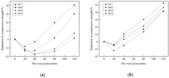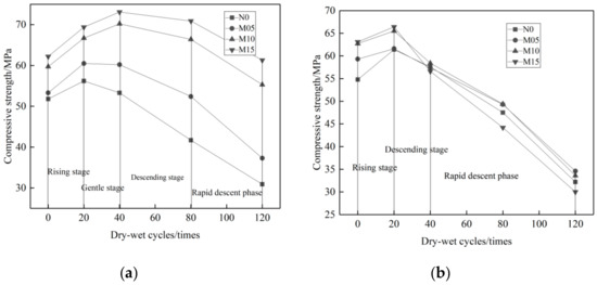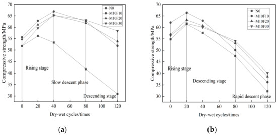 Figure 7b shows the compressive strength changes of admixture concrete in 10% MgSO4 solution. It can be divided into three stages: ascending, descending, and quick descending. Since MK contains a large amount of active Al2O3 and SiO2, it can react with CH in cement and produce C-S-H cementing material so as to improve the concrete porosity. However, Mg2+ can react with C-S-H and obtains hydration products, such as M-S-H and M-C-S-H, which will soften the cement basement and cause the degradation of the compressive strength of the concrete [44]. The side product of gypsum causes concrete expansion and property degradation as well. The MK admixture can weaken the MgSO4 erosion resistance of the concrete significantly. Compared to the reference concrete, the compressive strength of the MK admixture concrete is improved more slowly after 0–20 circulations, but decreased more rapidly after 20–120 circulations.
