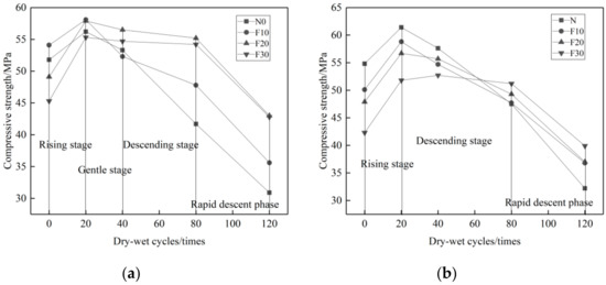 It can be seen from Figure 9 sthat the UFA concrete shows different tendencies of compressive strength changes in different solutions. In 10% Na2SO4, solution, the changes can be divided into four stages: ascending, flat, descending, and quick descending. In 10% MgSO4 solution, the changes can be divided into three stages: ascending, descending, and quick descending. After 0–20 cycles, the concrete compressive strength keeps rising in both solutions because, on one hand, the cementing materials like the cement are still in the hydration stage while, on the other hand, a small amount of SO42− ions get in and react with the hydration products in the slurry and produce a slightly corrosive medium, which works just like the filler. After 20–120 cycles, the concrete compressive strength degrades. Compared to the reference concrete, the compressive strength of the UFA admixture concrete degrades slowly in two types of solutions. The main reason is that UFA reacts with Ca(OH)2 in cement, which reduces the production of ettringite or gypsum, reducing the progress of the expansion and cracks caused by ettringite and gypsum.