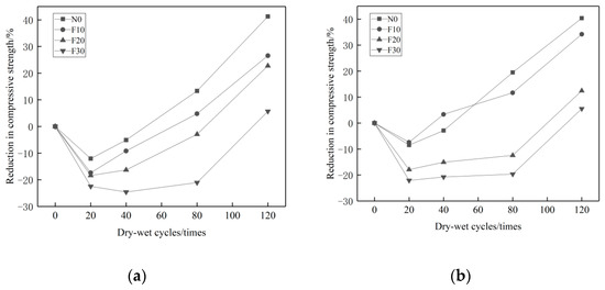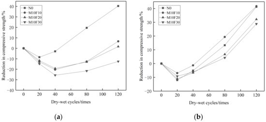 As shown in Figure 11a, after the Na2SO4 erosion and 0–40 cycles, the compressive strength of the reference concrete changes from an ascending to a descending tendency. The composite admixture containing MK and UFA with continuous grading cement particles produces superimposed effects, and further reduces the pores in the cementing system, achieving better concrete durability. Therefore, the compressive strength of composite admixture concrete keeps rising at this time. After 40–80 cycles, the compressive strength of the composite admixture concrete degrades more slowly compared to that of the reference concrete. Figure 11b shows that when the proportion of MK is set unchanged, the higher proportion of UFA, the less loss of compressive strength.